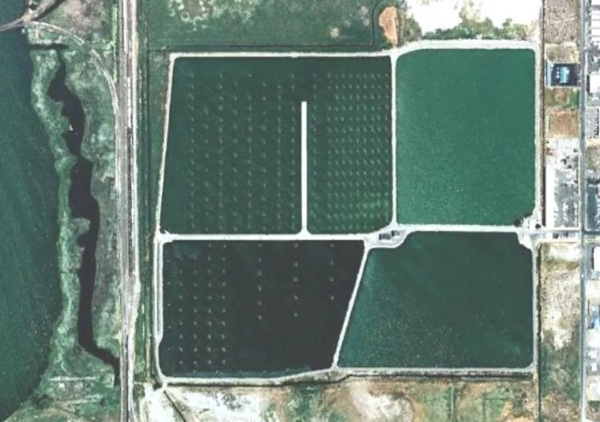 Ponds #3 and #4 have a combined surface area of 75 acres and a capacity of 176 million gallons and are equipped with vertical tube aerators. Screened wastewater enters Pond #4 and flows into Pond #3. To improve flow conditions, Pond #4 is divided into two zones by an earthen levee. Pond #3 is equipped with a membrane baffle wall which routes pond effluent along its south levee.